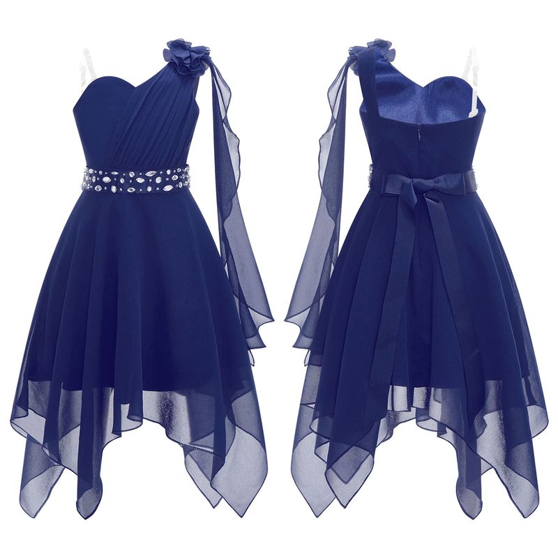 6-16Y Kids Wedding Girls Dress Sleeveless Elegant Ruched Applique Asymmetrical Hem Chiffon Princess Birthday Prom Party Dresses
