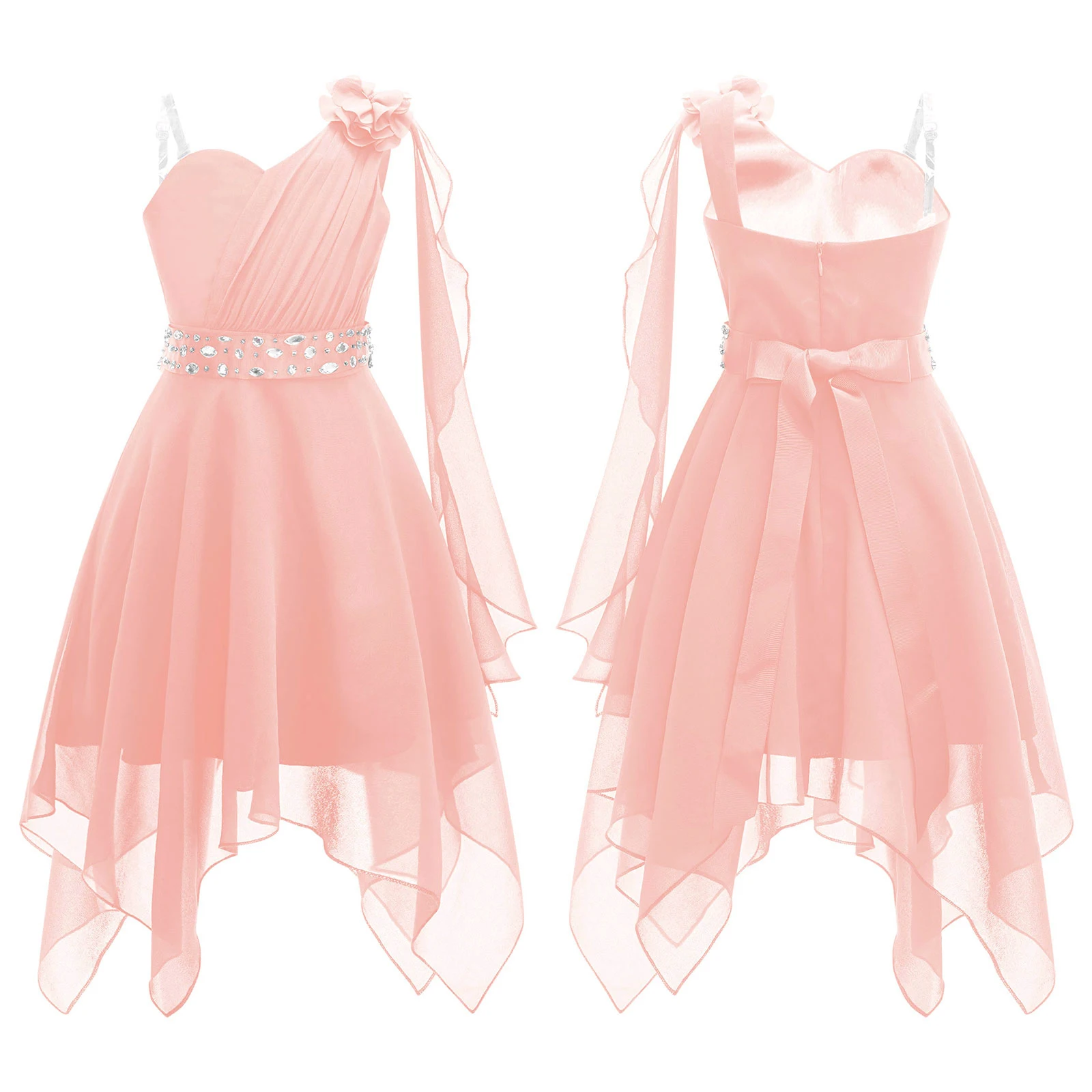 6-16Y Kids Wedding Girls Dress Sleeveless Elegant Ruched Applique Asymmetrical Hem Chiffon Princess Birthday Prom Party Dresses