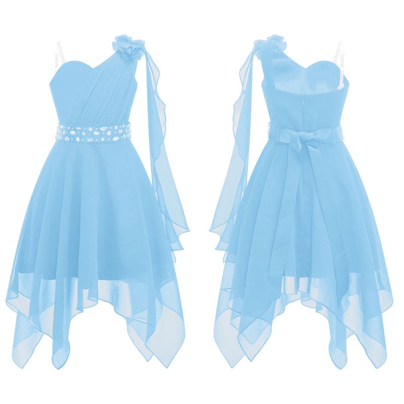 6-16Y Kids Wedding Girls Dress Sleeveless Elegant Ruched Applique Asymmetrical Hem Chiffon Princess Birthday Prom Party Dresses