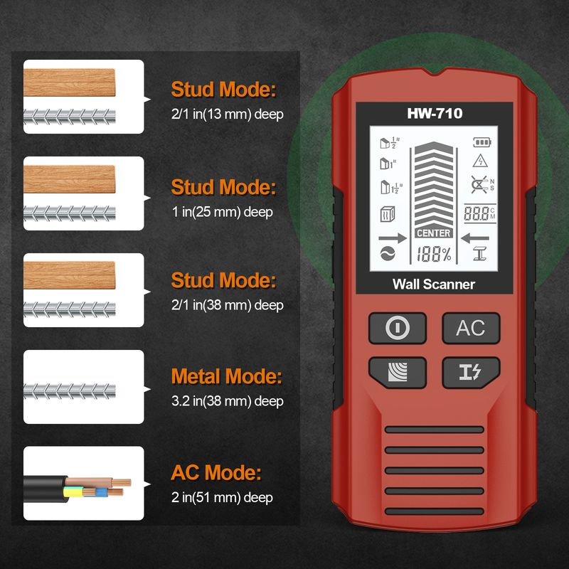 ·AC Mode:Detects live unshielded AC wires up to 51mm deep