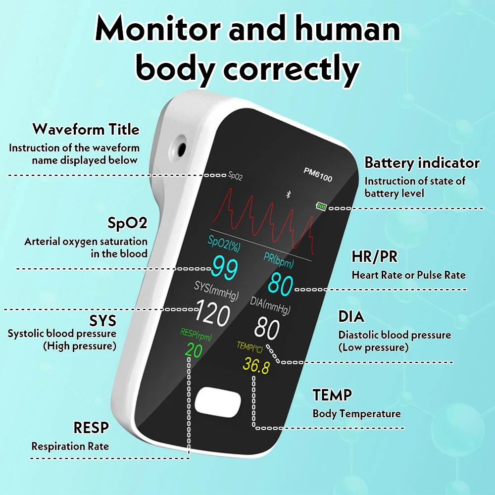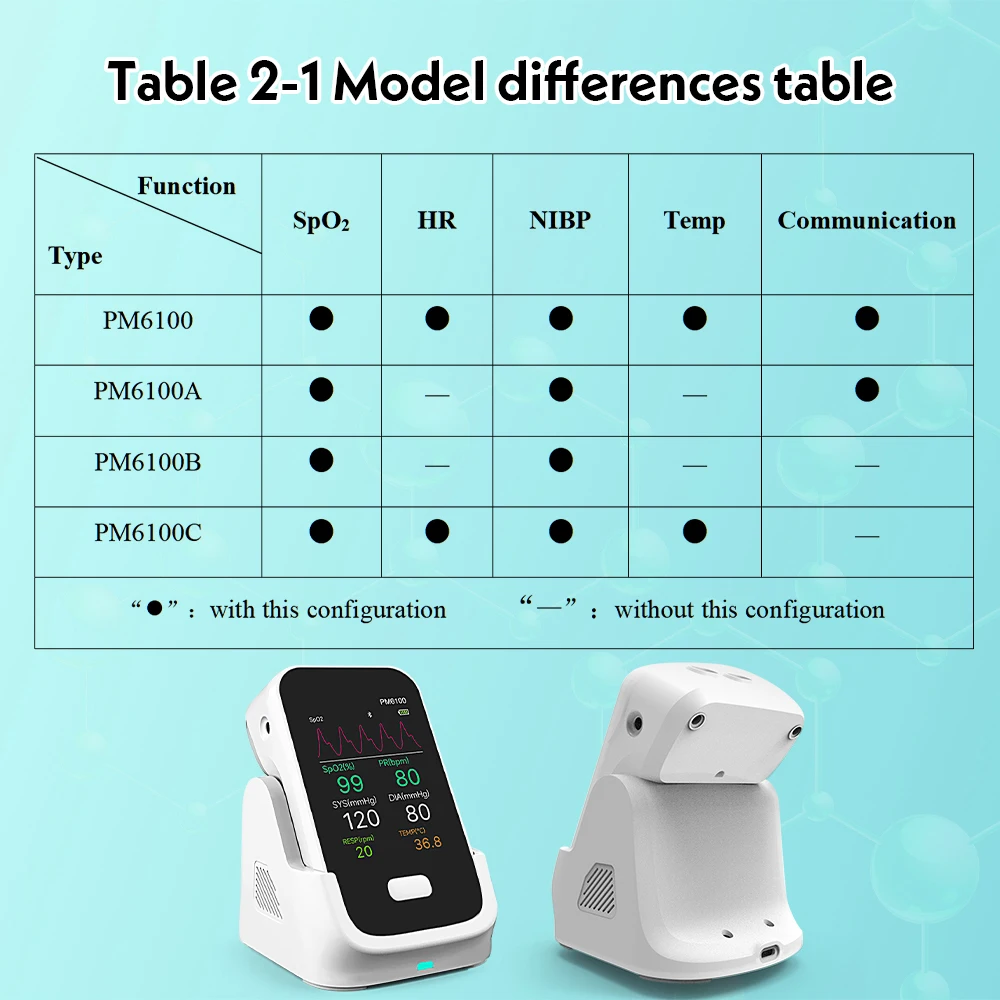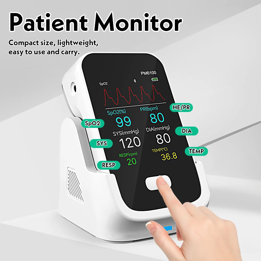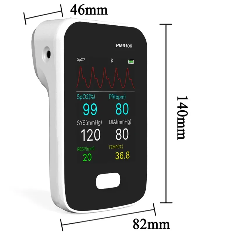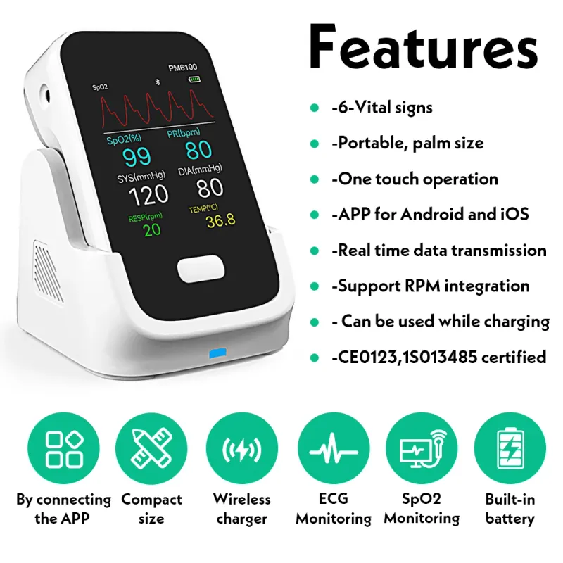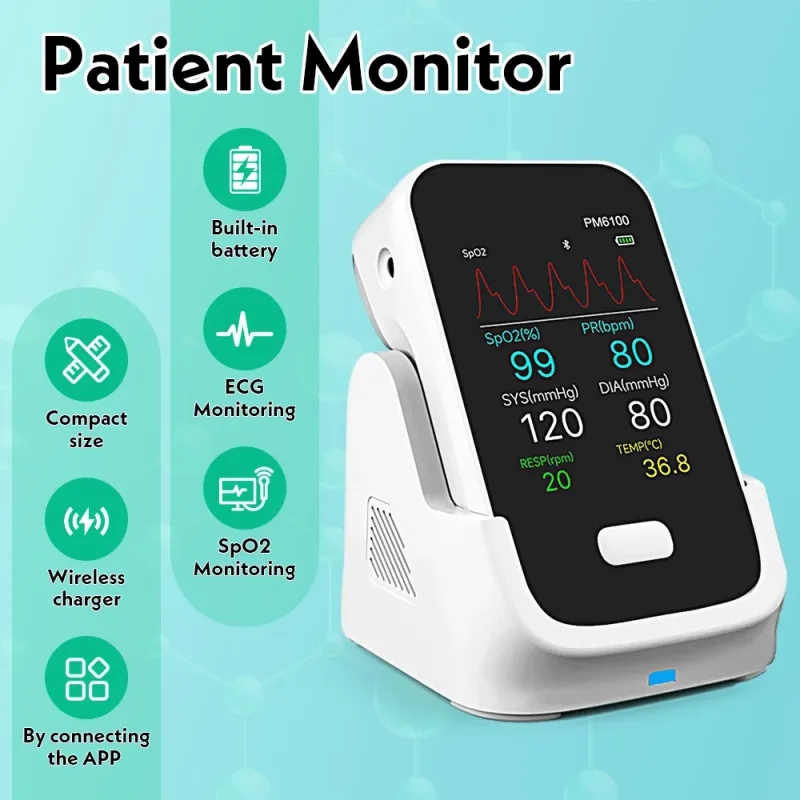 Wireless charging, TYPE C universal interface, specific blood oxygen sensor and blood pressure cuff, and ECG consumables. The quipment is simple to operate, small in appearance, convenient to carry, and is a reliable vital sign monitoring equipment.