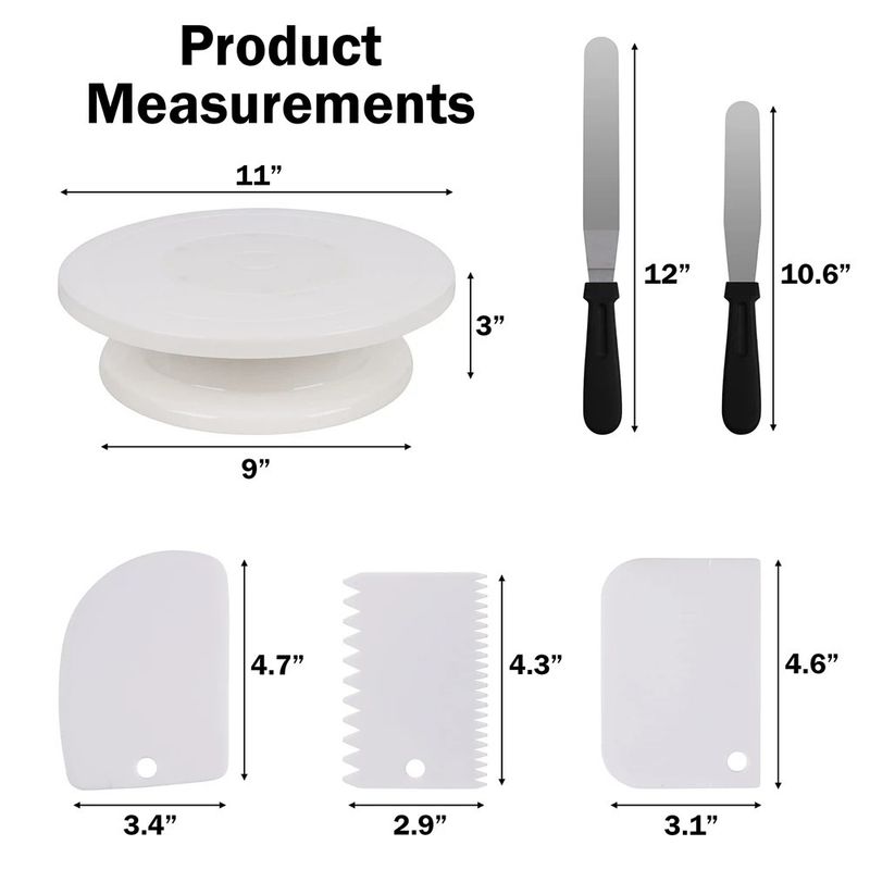 Practical Cake Turntable: This cake turntable comes with two right-angled frosting scrapers and three spatulas. Made of food-grade PP, it's safe and reliable. With an 11-inch diameter, it allows you to easily create beautiful borders or professional cake designs without worrying about foreign objects getting mixed into your food.