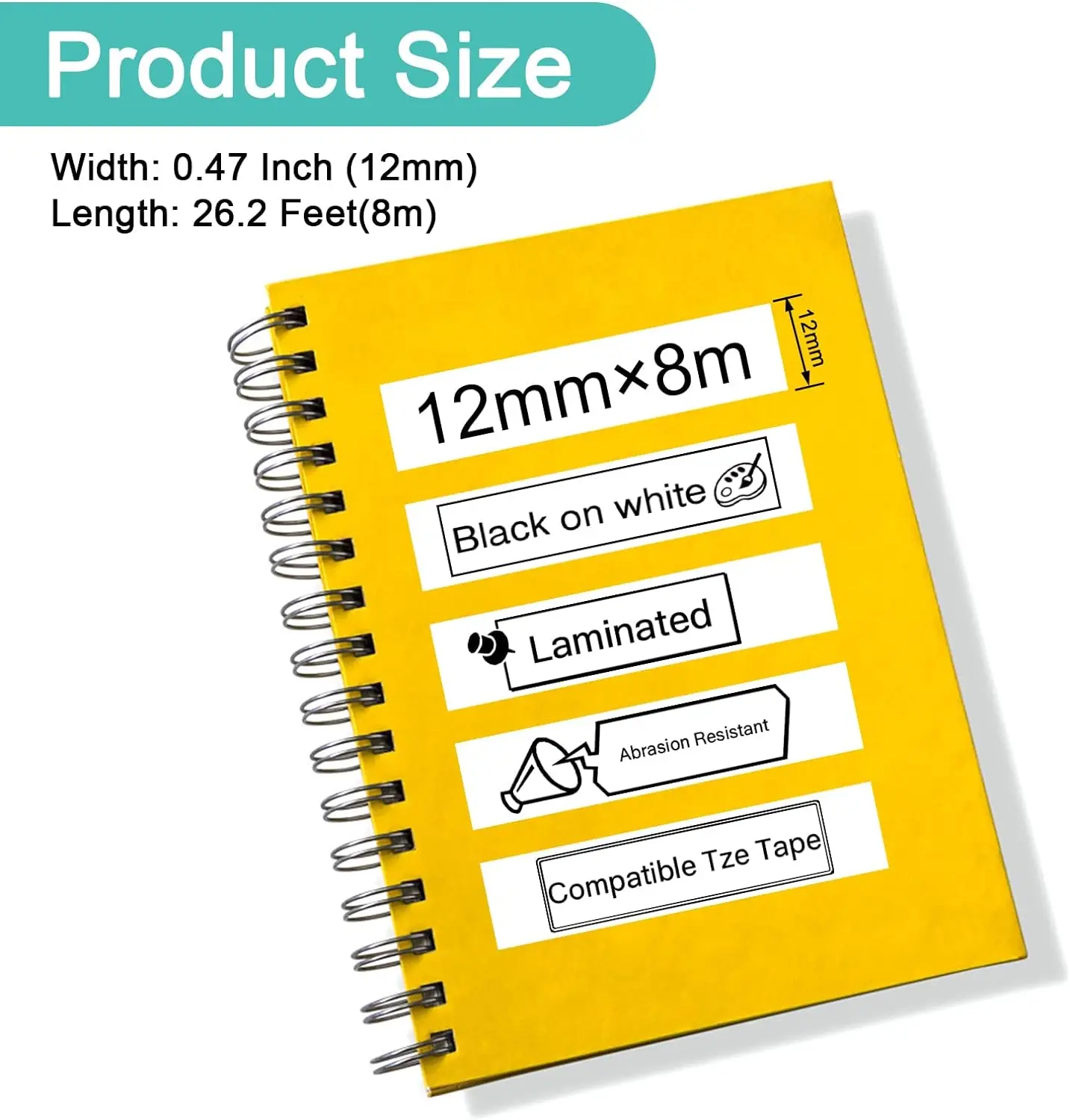 Size: 6mm, 9mm, 12mm, 18mm, 24mm x 8 meters (but fluorescent tapes are 5 meters)