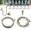 1. It is recommended to installed the misting system at a height of 2.5m-3m.2. Connect the adapter to the water tap.3. Turn on the water tap to wash the system for 1 minute to purge the system and remove any impurities.4. Screw the misting nozzles to the Tee fittings, except the last one on the end plug.5. Turn on the water tap to wash the system for 2 minutes to insure that the system is fully purged.6. Turn the water off and install the last nozzle into the fitting with the end plug.7. Fix the misting line by the cable ties saddle clamps provided.8. Turn on the tap slightly until jets are working, enjoy the cooling misting system .9. Turn off the nozzles, keep them dry and clean when you don't use the misting system for a long time