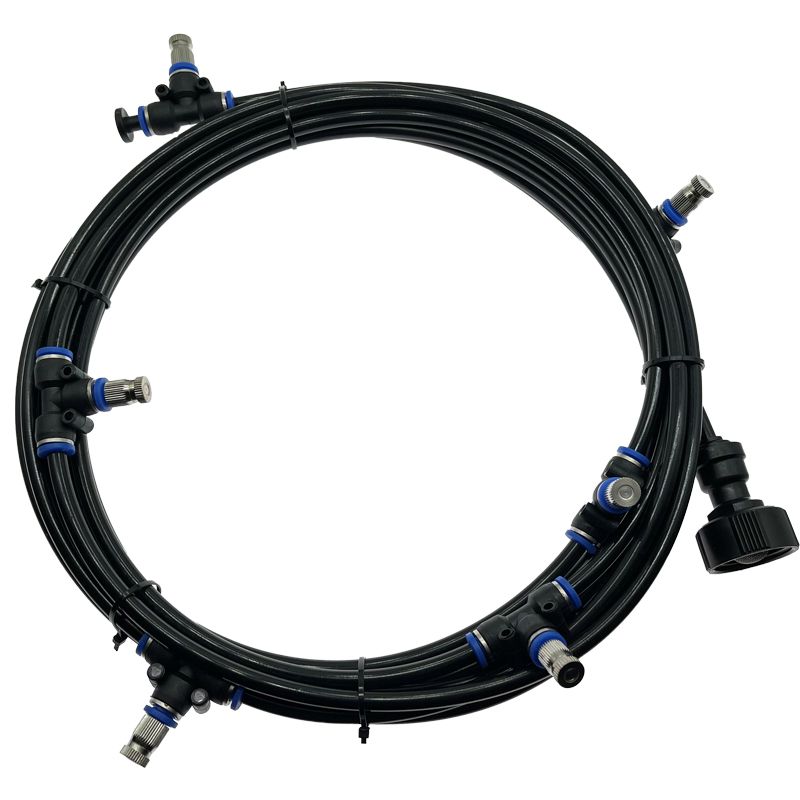 1.  It is recommended to installed the misting system at a height of 2.5m-3m.2.  Connect the adapter to the water tap.3. Turn on the water tap to wash the system for 1 minute to purge the system and remove any impurities.4. Screw the misting nozzles to the Tee fittings, except the last one on the end plug.5. Turn on the water tap to wash the system for 2 minutes to insure that the system is fully purged.6. Turn the water off and install the last nozzle into the fitting with the end plug.7. Fix the misting line by the cable ties saddle clamps provided.8.  Turn on the tap slightly until jets are working, enjoy the cooling misting system .9. Turn off the nozzles, keep them dry and clean when you don't use the misting system for a long time