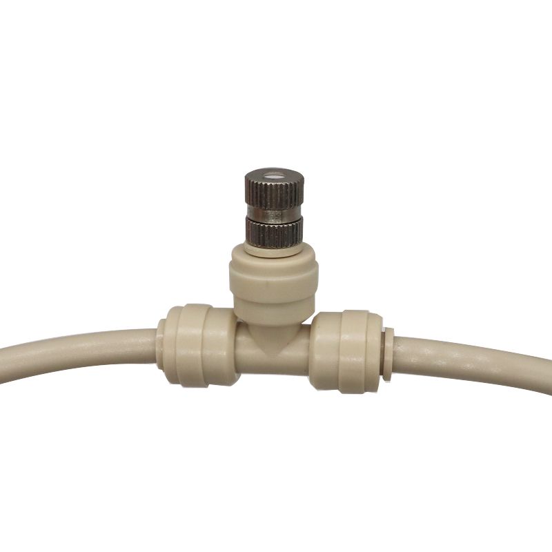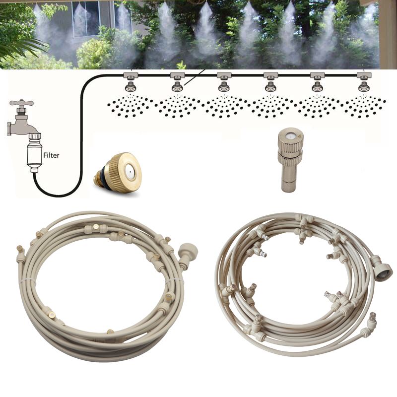 1. It is recommended to installed the misting system at a height of 2.5m-3m.2. Connect the adapter to the water tap.3. Turn on the water tap to wash the system for 1 minute to purge the system and remove any impurities.4. Screw the misting nozzles to the Tee fittings, except the last one on the end plug.5. Turn on the water tap to wash the system for 2 minutes to insure that the system is fully purged.6. Turn the water off and install the last nozzle into the fitting with the end plug.7. Fix the misting line by the cable ties saddle clamps provided.8. Turn on the tap slightly until jets are working, enjoy the cooling misting system .9. Turn off the nozzles, keep them dry and clean when you don't use the misting system for a long time