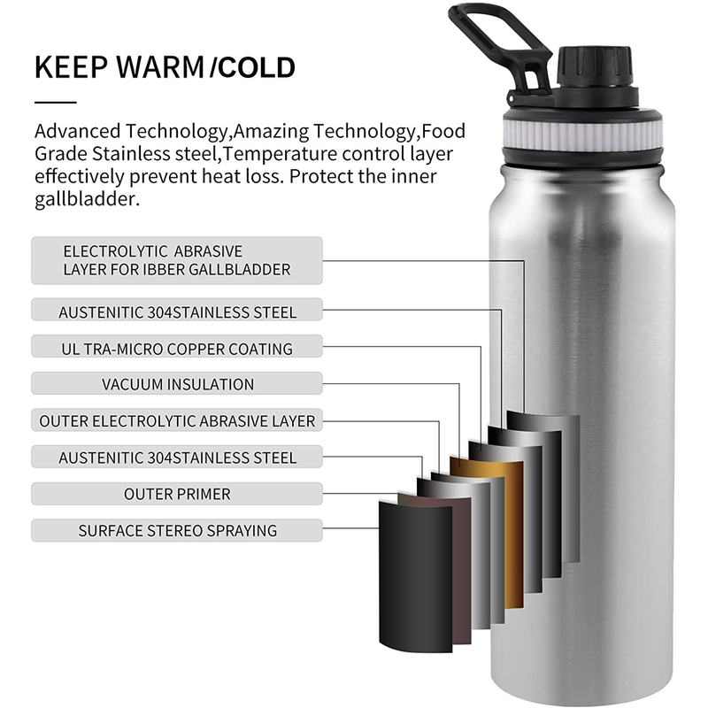 304 stainless steel water bottle keeps beverages ice-cold for 24 hrs., and hot for up to 12 hrs. with double-wall insulation. This BPA-free, food-grade water bottle won't transfer flavors and does not sweat.