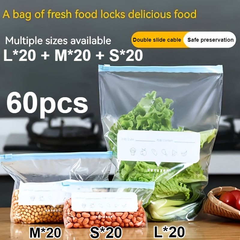 60pcs Zippered Food Storage Bags Three Sizes for Fruits Grains Vegetables Meat Fresh Keeping Sealing Kitchen Storage Accessories