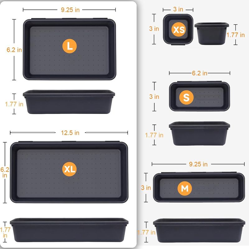 -- Our tool box organizer bins include 24 trays:5 x XL size (12.5x6.2x1.77in), 5 x L size (9.25x6.2x1.77in), 4 x M size(9.25x3x1.77in), 4 x S size(6.2x3x1.77in), 6 x XS size(3x3x1.77in).