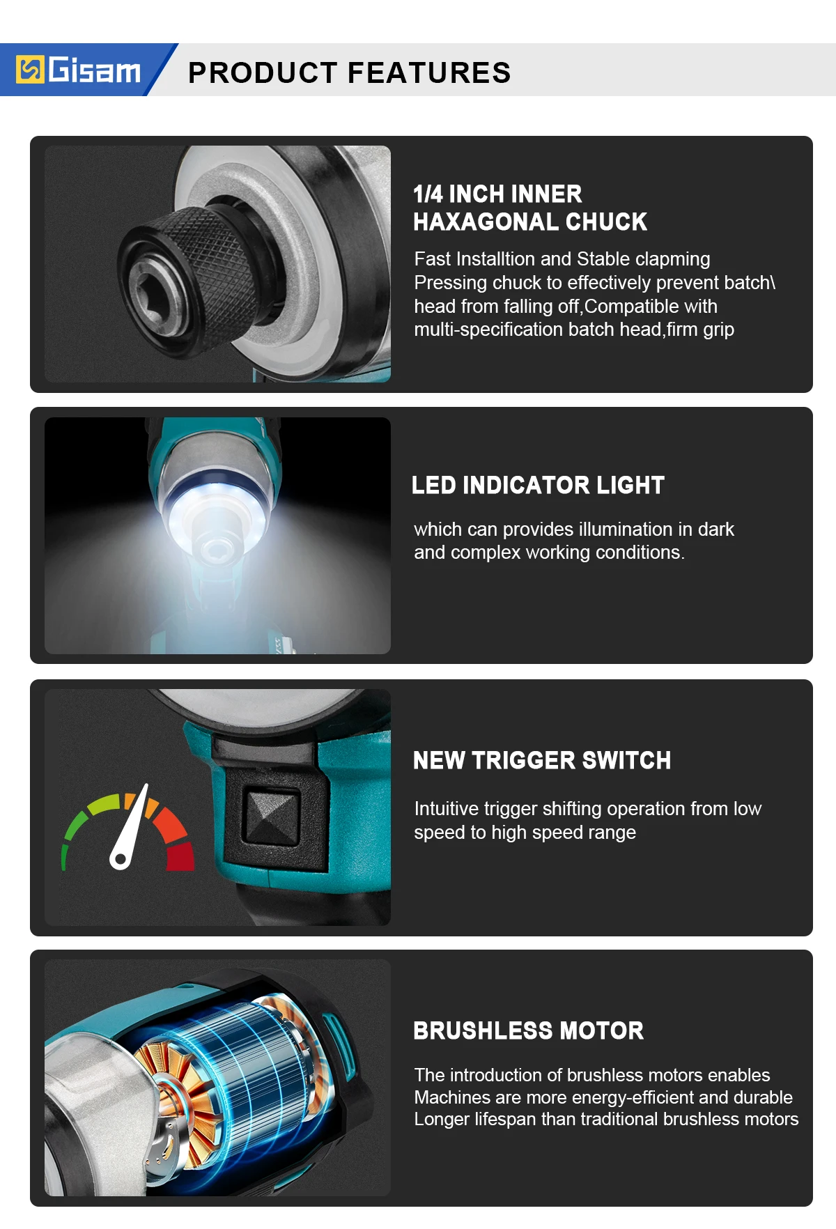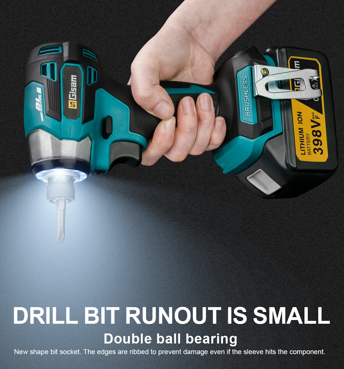 - Added 12 LED ring-shaped LED lights: improve visibility during work, about 2.5 times brighter (compared to traditional 18V machines),which can increase your visibility in enclosed workspaces or any dark environment and let you effortlessly screw wood, plastic, drywall, brick, concrete, and metal.