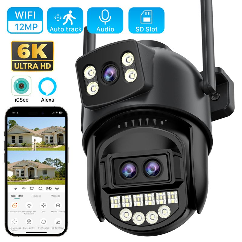 3-lens, 2-screen, Notifications alarm, humanoid tracking, two way voice intercom 360 monitoring, full color night vision, IP66 waterproof, mobile phone remote monitoring,Share video, SD card storage, 24 hours video recording