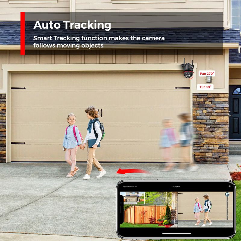 After locking the target, the camera will adjust the pan rotation automatically, Tracking Moving Human and push alerts notifications to your Smartphone.
