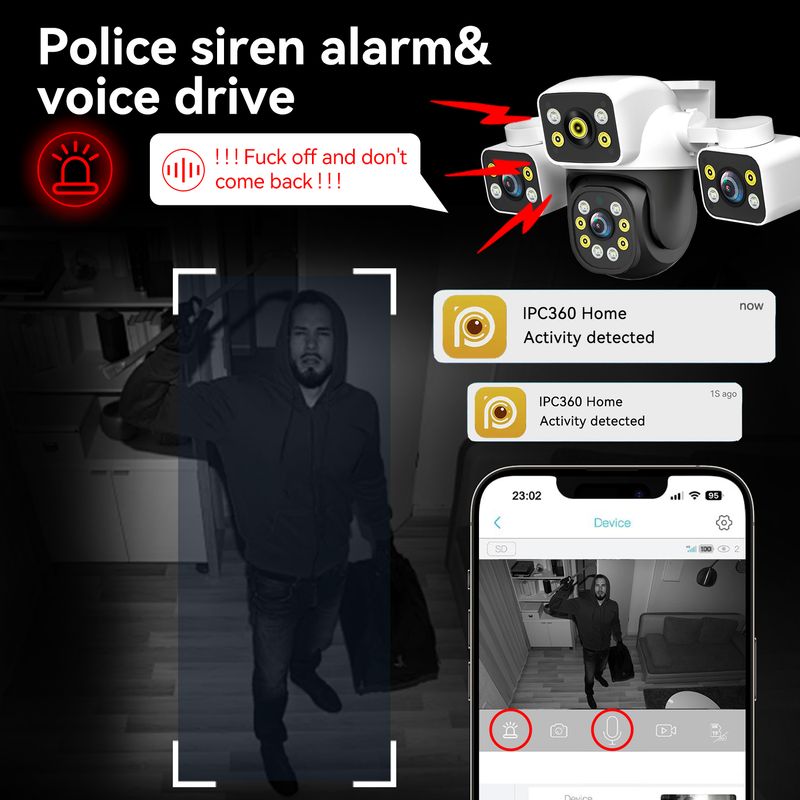 Deter intruders  Siren, flash, and voice warnings in 8 languages.