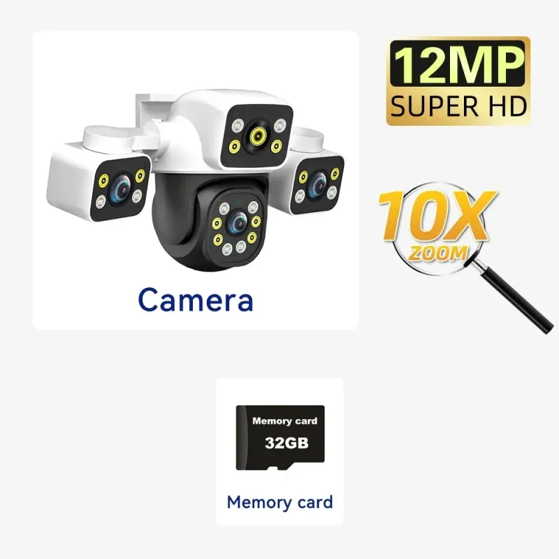 6K 12MP Outdoor WiFi Security Camera, Triple Lens Triple Screen 10X Zoom PTZ Auto Tracking Sound Light Alarm