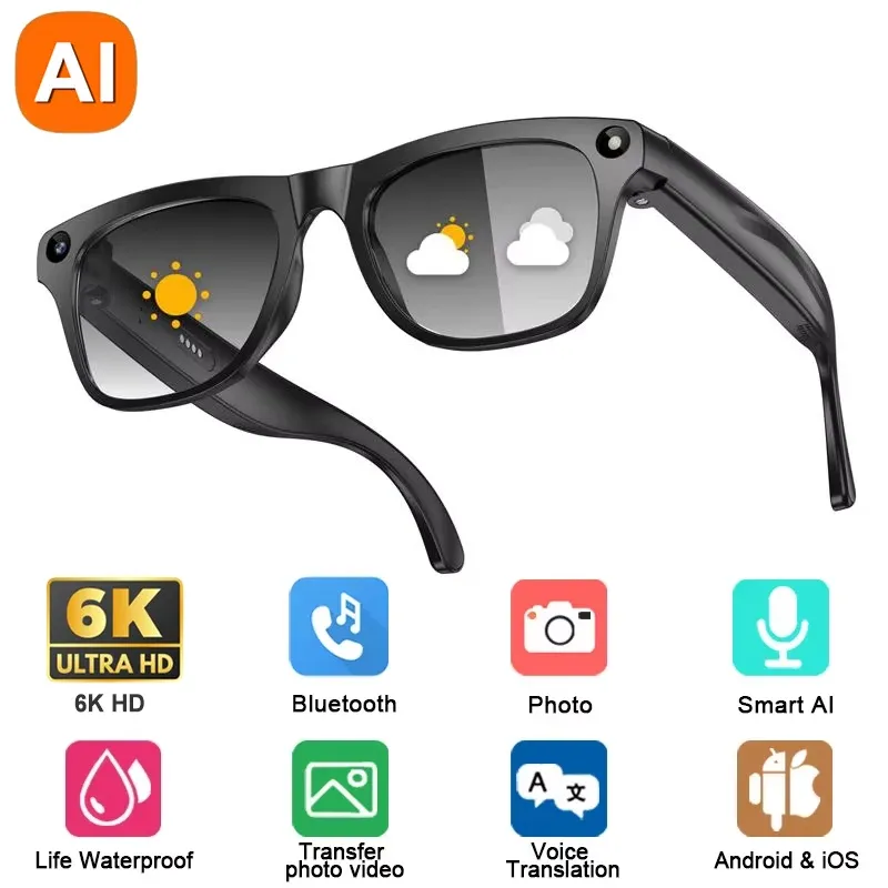 6K HD AI Camera Glasses 800MP Photochromic Multifunctional Smart Glasses Bluetooth Calling Photo Video ChatGPT Music Translation