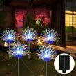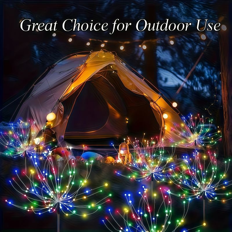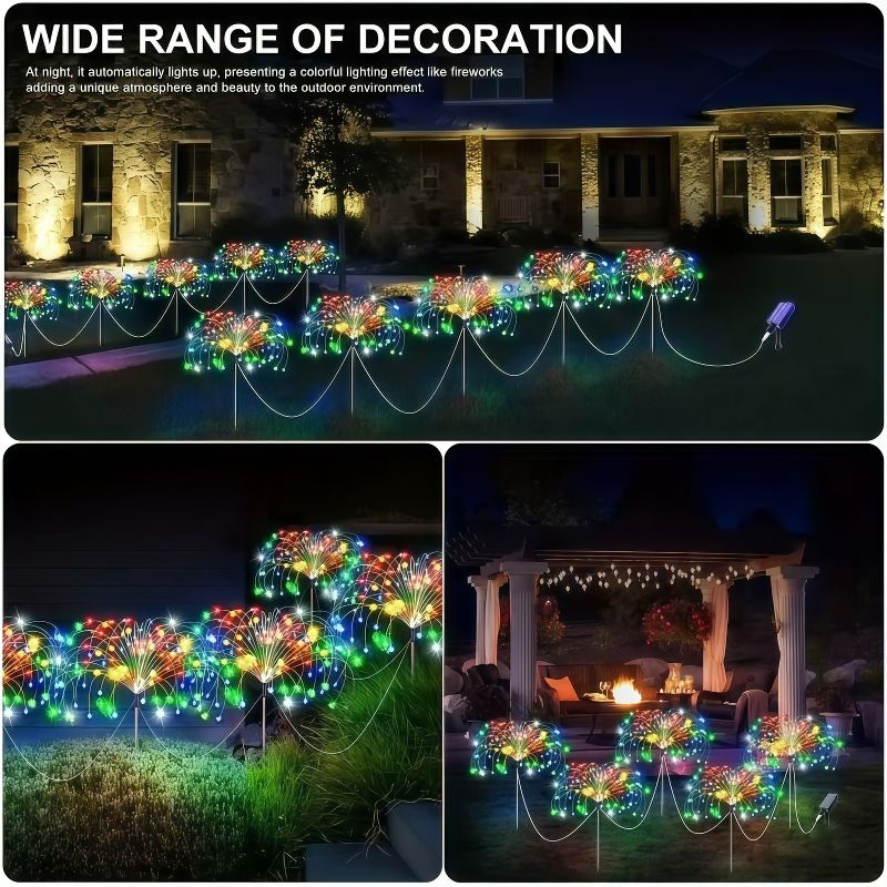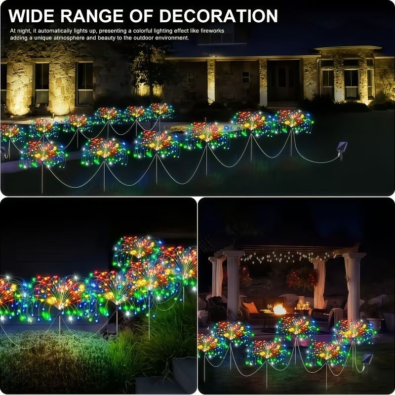 flexible and high-quality copper wires. You can flexibly DIY any shape, such as flowers, trees, fireworks, Ferris wheel, heart, spiral, sphere. These solar fireworks lights are decorated with colorful lights and are perfect for your garden, yard, lawn, flower beds, terraces, sidewalks, and driveways.