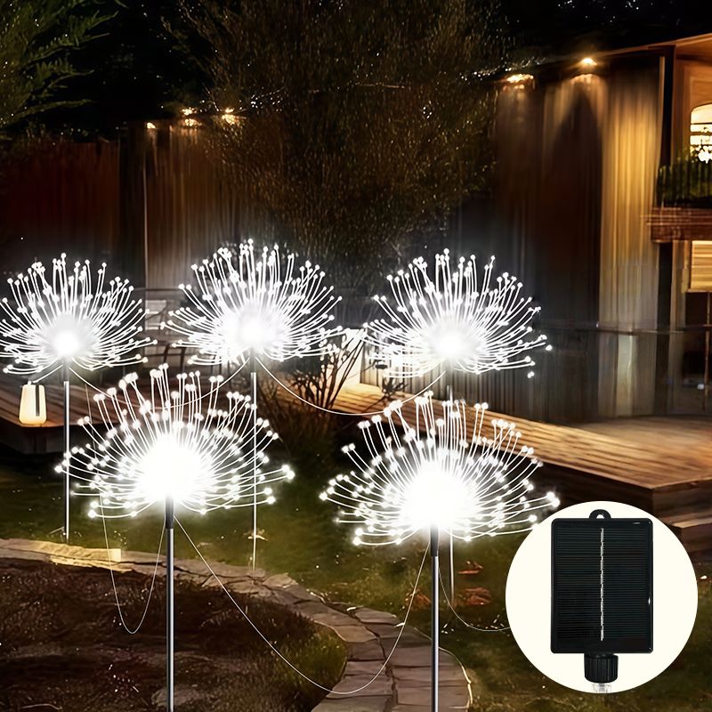 flexible and high-quality copper wires. You can flexibly DIY any shape, such as flowers, trees, fireworks, Ferris wheel, heart, spiral, sphere. These solar fireworks lights are decorated with colorful lights and are perfect for your garden, yard, lawn, flower beds, terraces, sidewalks, and driveways.