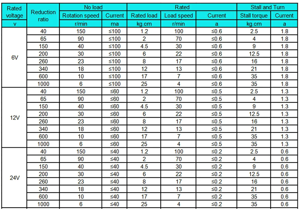 Before you buy, we have a reminder, please carefully check the following parameters table, you can see the rated load torque and stall torque, if you choose one of the speed, your project load can not exceed load torque, otherwise the motor current will increase, the motor operating temperature increases, after a period of time, the gear will be worn, line will be burnd, the motor will be damaged, can not continue to work.