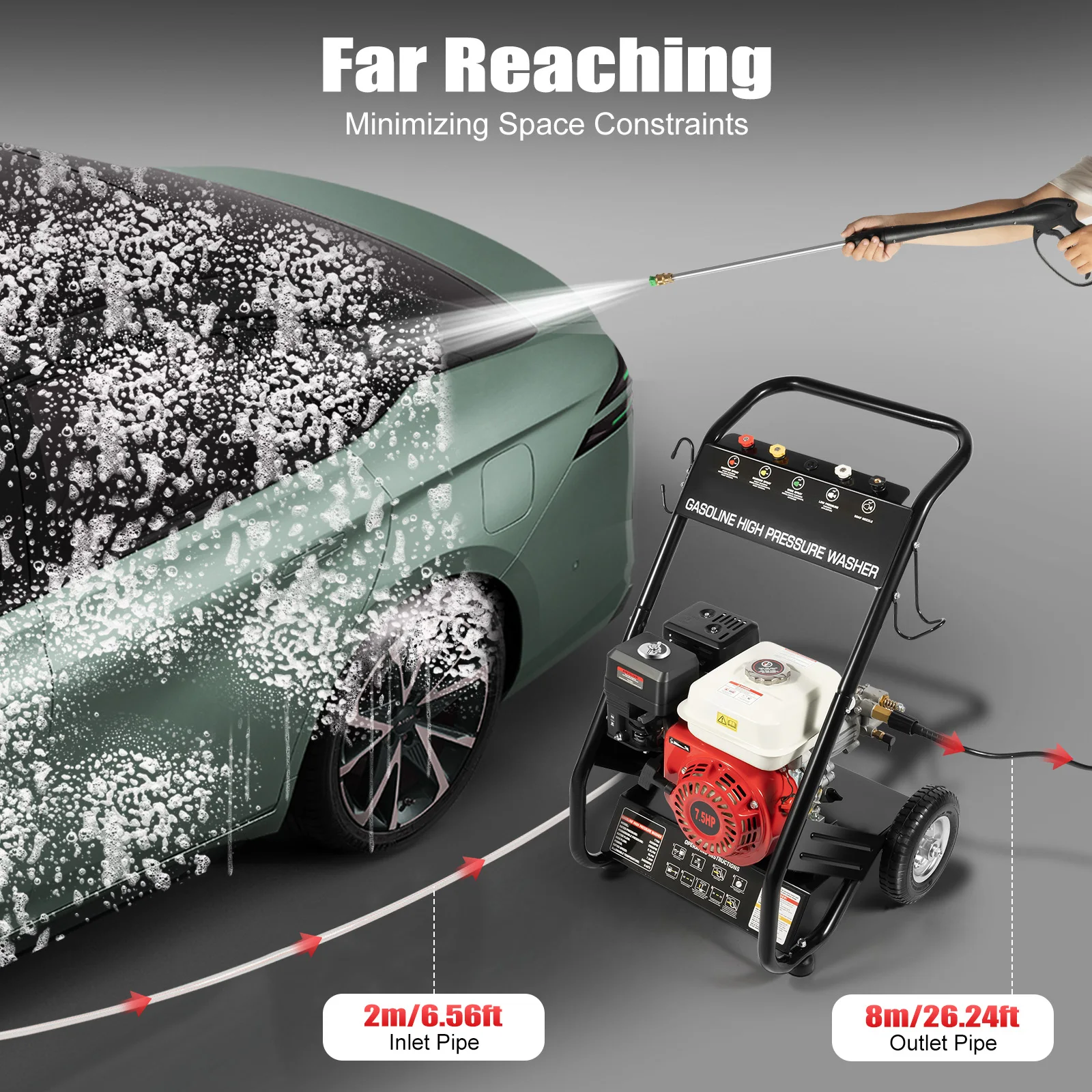 Highly Efficient: It is equipped with a 7.5 horsepower engine, with a speed of up to 3400 RPM, a pressure of 2200 PSI, and a flow rate of 2.3 GPM, which can quickly complete the most demanding cleaning tasks. Start enjoying a quick solution for stubborn stains now, making cleaning simple, efficient, and easy!