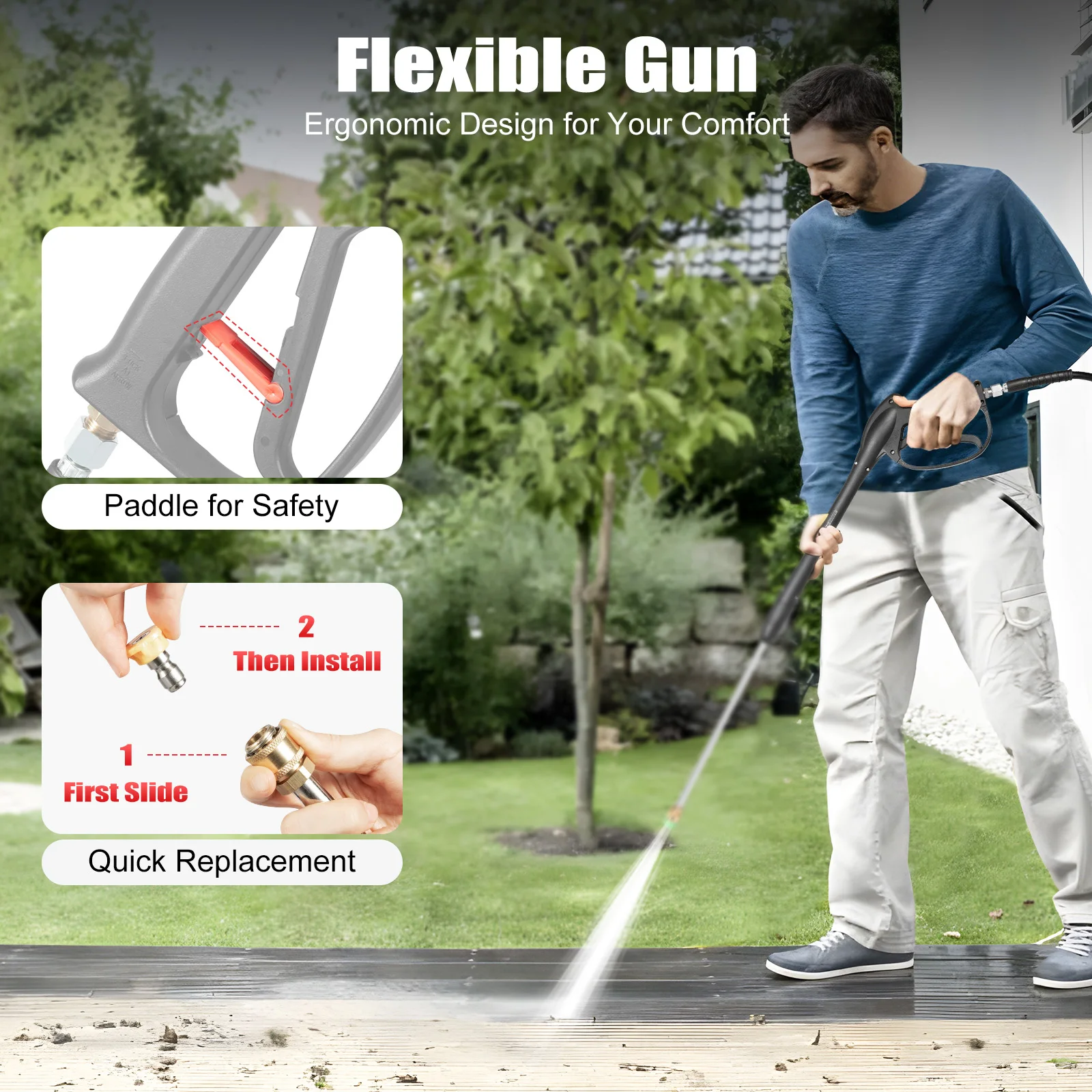 Flexible Gun: The ergonomically curved spray gun handle has a small paddle that can hold the pick to prevent sudden activation of the spray gun. In addition, if you want to replace the nozzle, simply slide the buckle at the top of the spray gun backward to achieve quick replacement.