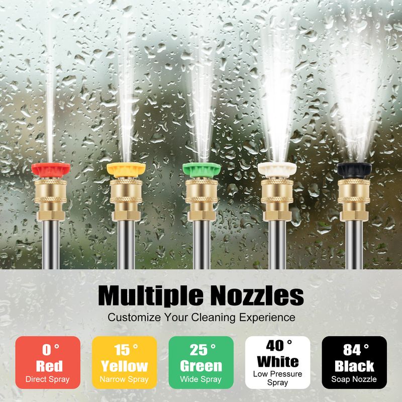 Multiple Nozzles: Come and use 5 different nozzles to customize your cleaning experience, so you can easily switch between different spray modes! Red and yellow are 0 ° and 15 ° narrow nozzles with high pressure; Green is a 25 ° nozzle used for larger areas of enhanced cleaning; White is a 40 ° wide nozzle with lower pressure; Black is an 84 ° wide nozzle that produces rich foam to help with the cleaning.