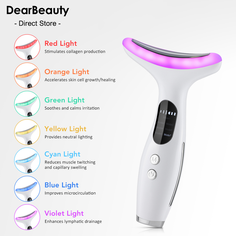 1. This neck face lifting massager features 7-color LED technology (Red Light: Stimulates collagen production. Orange Light: Relaxes skin & accelerates cell growth/healing. Green Light: Soothes and calms irritation. Yellow Light: Provides neutral lighting. Cyan Light: Reduces muscle twitching and capillary swelling. Blue Light: Improves microcirculation. Violet Light: Enhances lymphatic drainage.) to target different skin concerns for a more radiant and rejuvenated appearance.