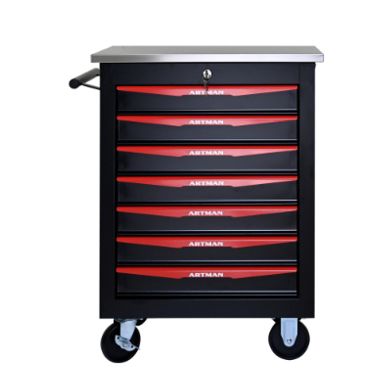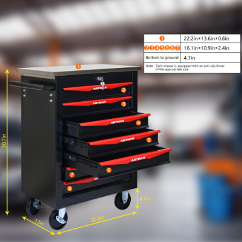 Product Name:7 Drawers Multifunctional Tool Cart with Wheels,Metal Rolling Tool Cart Storage for Garage Workshop Warehouse Repair Shop--With Stainless Steel Roof- BLACK&RED