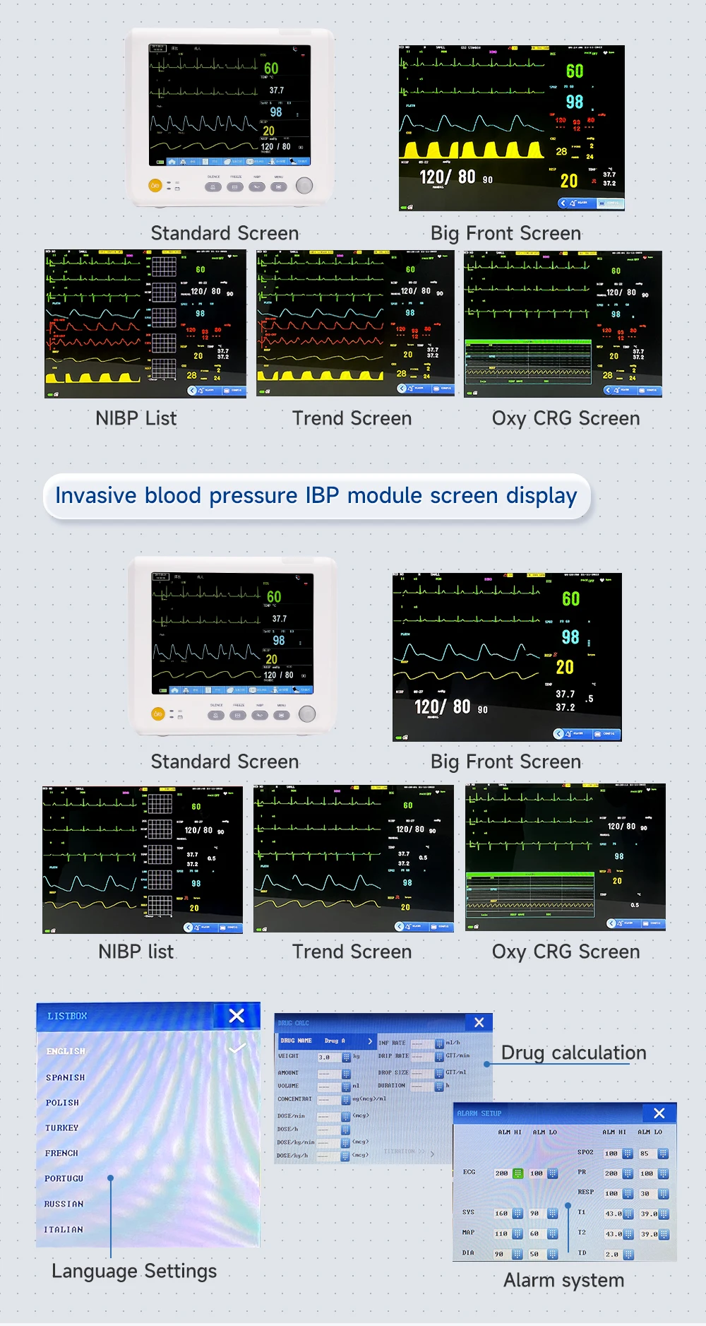 * Various interfaces:standard screen, trend screen, oxyCRG screen, big front screen.