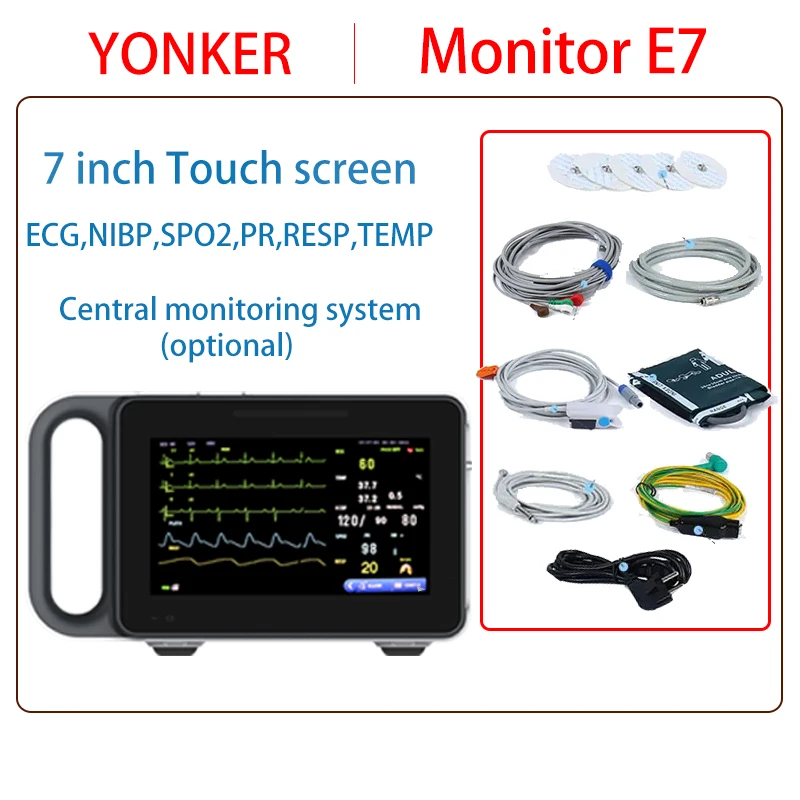 Multifunctional monitor, adult blood pressure cuff, high precision temperature probe, 3-wire ECG, blood oxygen probe.