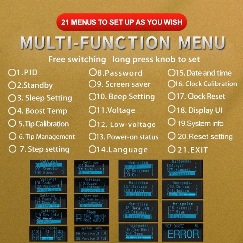2: In the normal mode, long press the encoder to enter the setting menu, short press to select, short press again to cancel the selection, and long press the encoder in the menu interface to exit and return to the previous level!