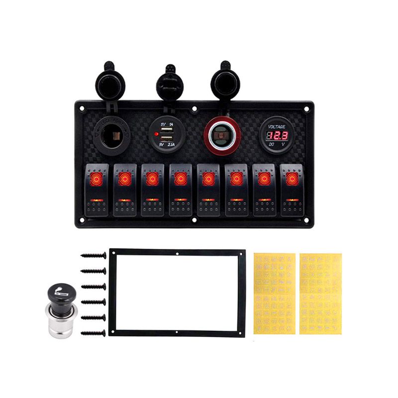 8 Gang Rocker Switch Panel Circuit Breaker Overload Protected Voltmeter 12V 24V DC USB Charger Port RV Car Boat Marine Blue LED