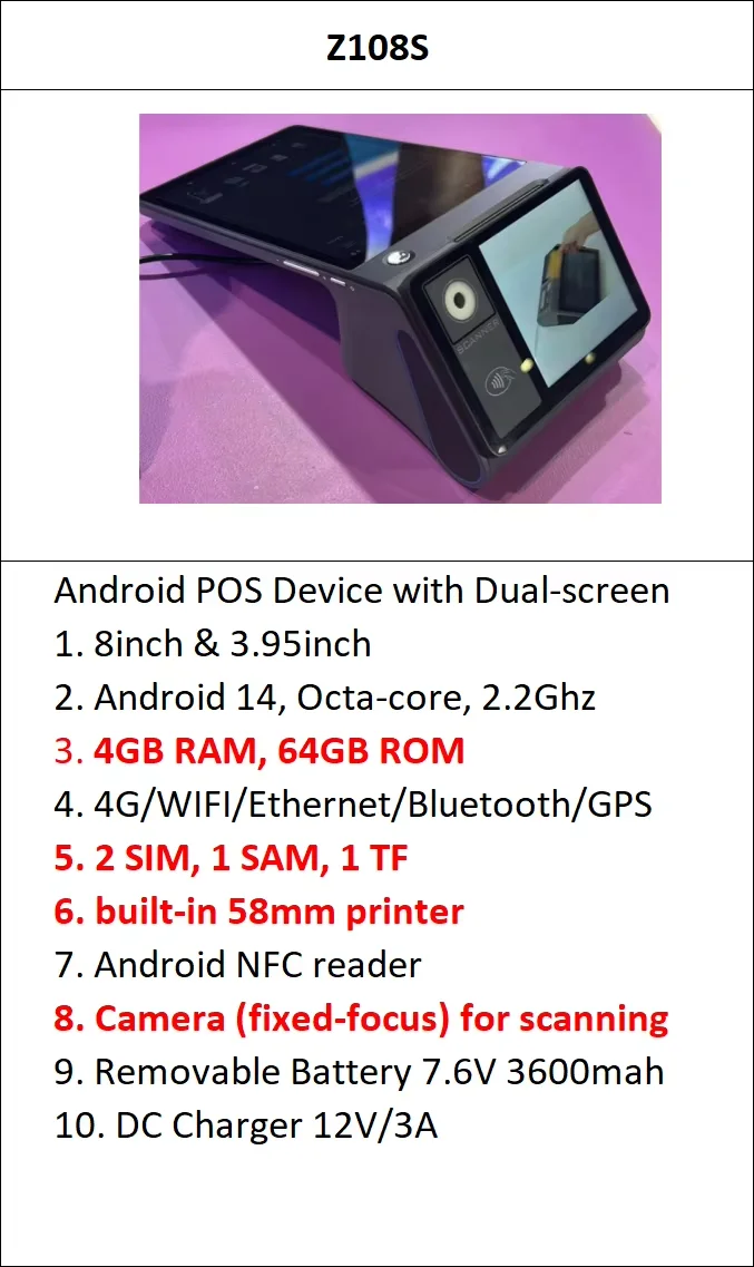 Z108 8 INCH Android POS with 58mm printer , Android 14.0 operating system,8 inch screen touch and 3.95 customer screen display(2.6 Inch screen optional), super long standby battery capacity is 3600 mAh/7.6V, thermal paper printer, 5 Mega-pixel rear camera, 2G /3G / 4G /wifi, bluetooth communication, this fine workmanship and top quality machine is the best choice in the market.
