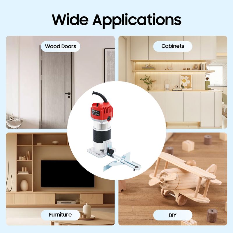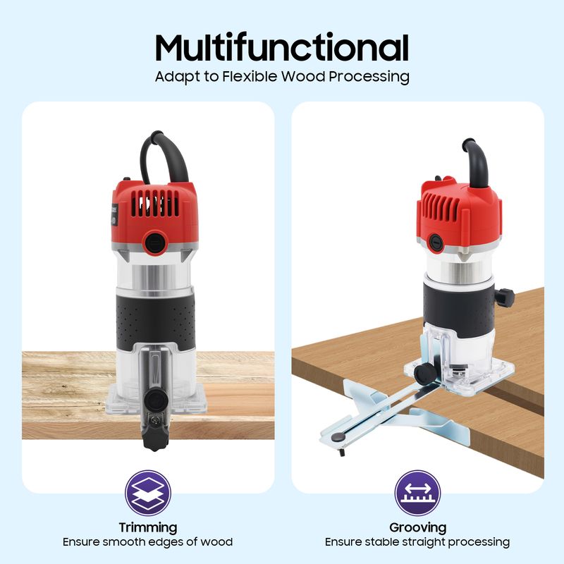Our woodworking trimmer is a high-performance machine designed for woodworking processing and is suitable for various application scenarios, such as wood grooving, edge trimming, and DIY crafts processing. It utilizes advanced motor technology and a precision structure to efficiently and accurately finish trimming tasks. Whether you are a professional woodworker or a DIY enthusiast, it can provide you with an excellent processing experience.