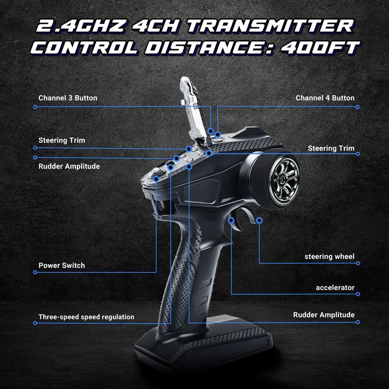 2. Equipped with front narrow and rear wide all terrain racing tires, and a spoiler for smoother top speeds.