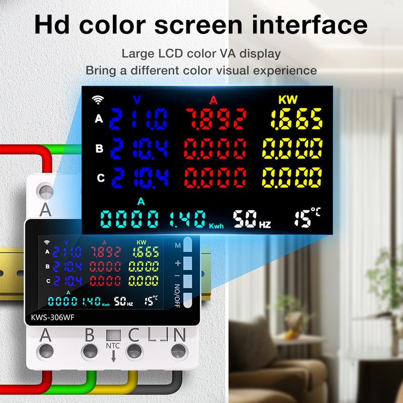 85-290V WiFi Power Meter KWS-306WF Digital Energy Tester Current Voltage Protector Relay Switch Color Screen 3P Guide Rail Table