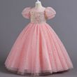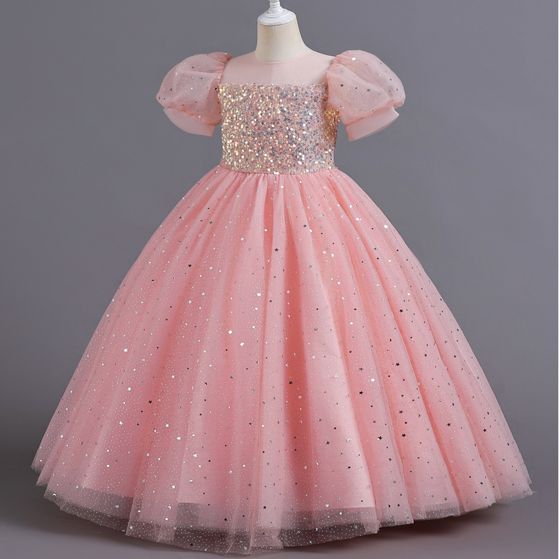 8903 Children's Dress Girls' Princess Sequin Bubble Sleeve Long Mesh Flower Little Girl Wedding For Summer