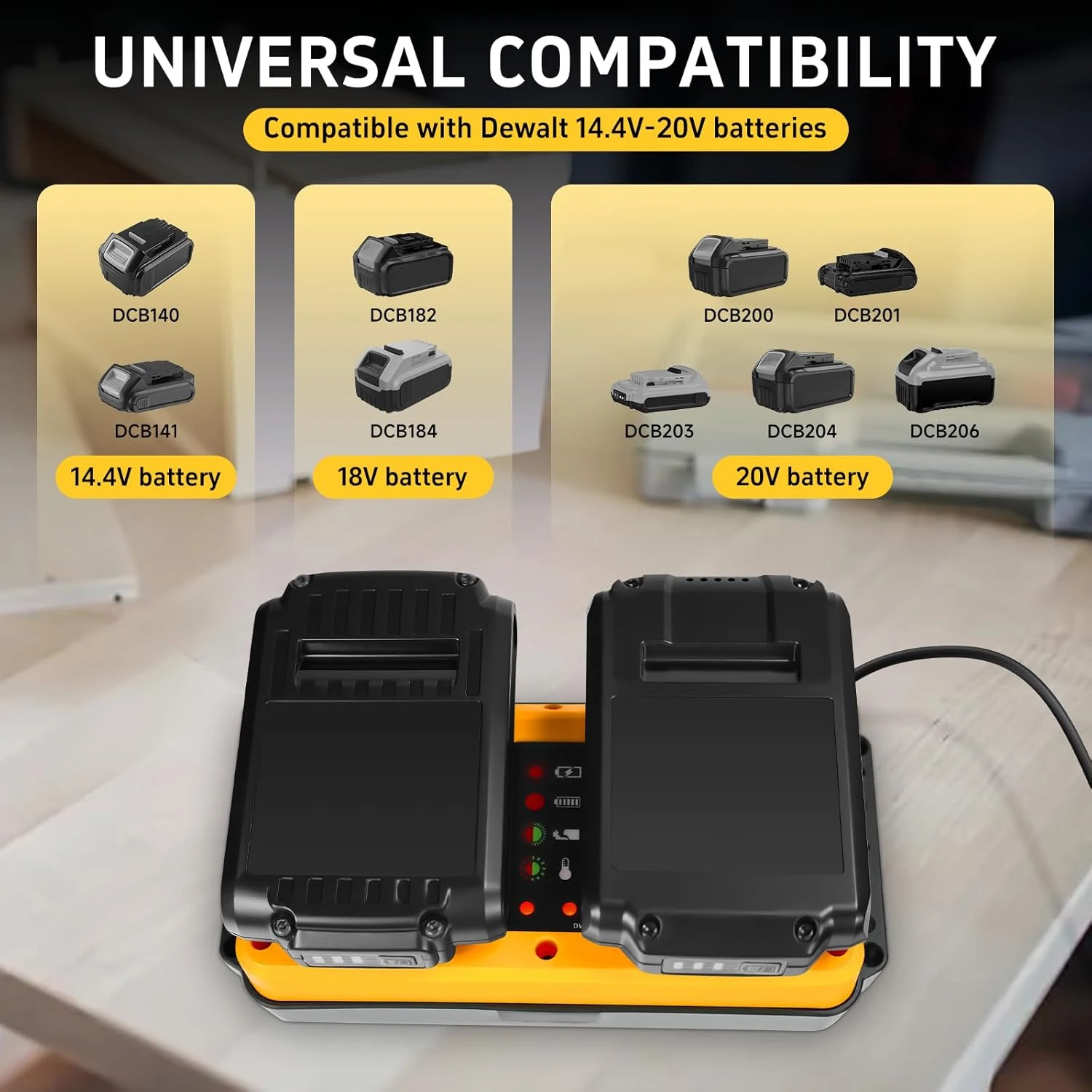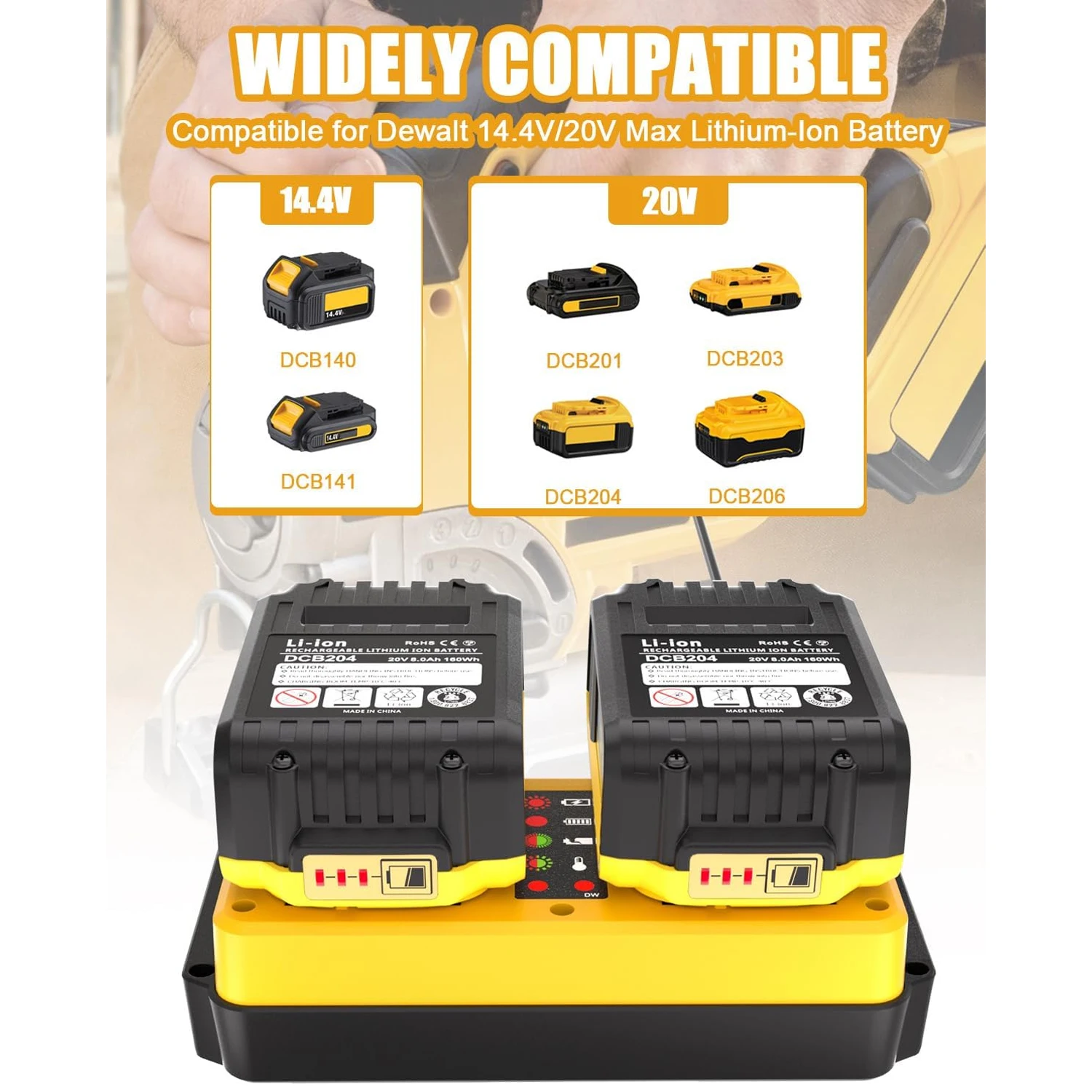 【Widely Compatible】The 14.4Volt / 20Volt battery charger is compatible for Dewalt 14.4Volt 20Volt Lithium-Ion batteries DCB206 DCB204 DCB208 DCB200 DCB201 DCB203 DCB140 DCB141 and more. It can also replacement for De walt 20v battery charger DCB104 DCB107 DCB112 DCB115 DCB118 etc