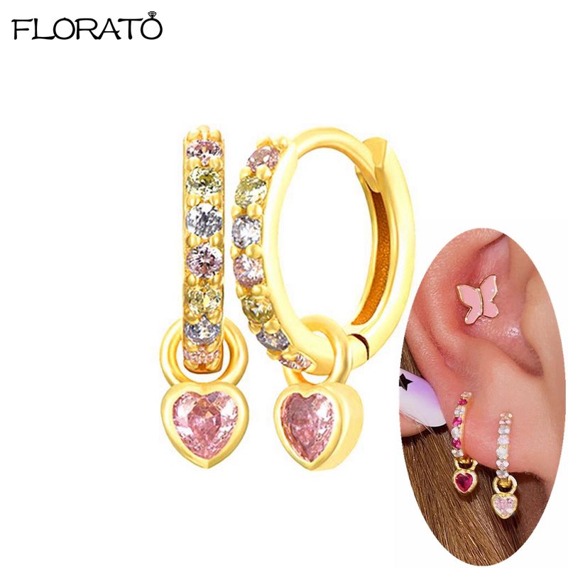 925 Sterling Silver Needle Cute Pink Heart Earrings 24K Gold Hoop Earrings for Women Fashion Puncture Jewelry Ear Accessories