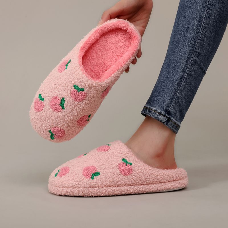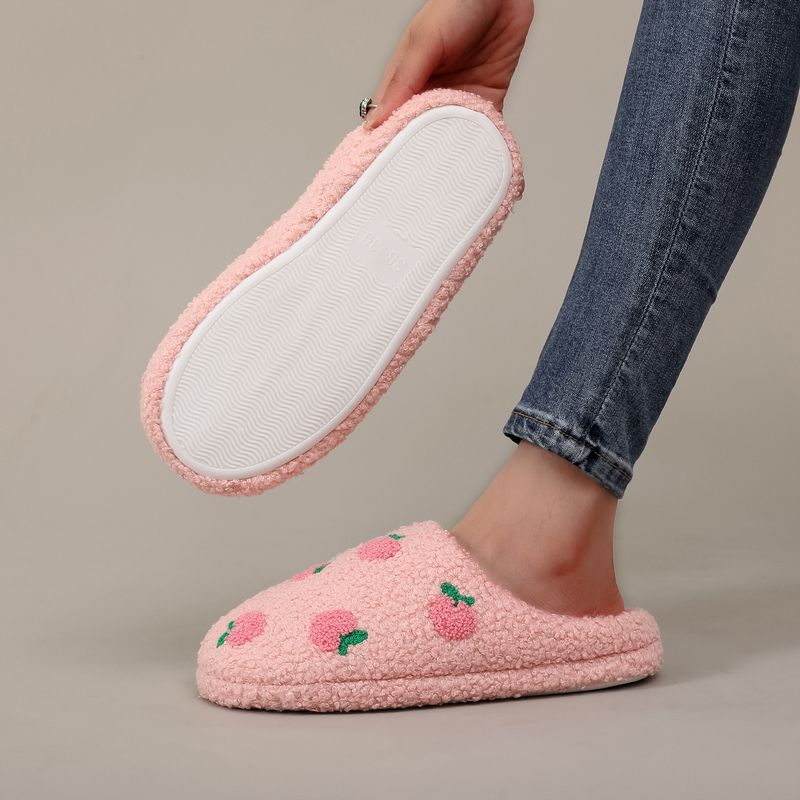 A Pair of Girly Pink Peach Embroidered Fruit Pattern Plush Home Soft-Soled Comfortable Furry Slippers Cute Warm Non-Slip Indoor Slippers for Men and Women Can Wear Lightweight Silent Comfortable Shoes, the First Choice for Gifts