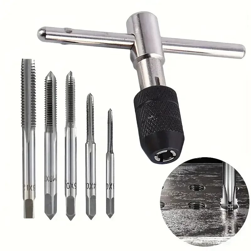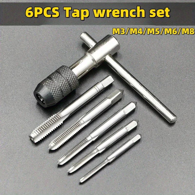 A Set of 6 Metric Taps, Including Taps, Drill Bits, and T-Handle Wrench Set, Suitable for M3-M8 Machine Screw Threading Tools, Twist Drill Bits