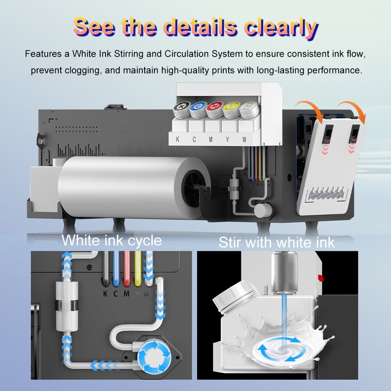 1.Anti-clogging design:White ink circulation and mixing + scheduled automatic cleaning provide dual protection to eliminate clogging issues.