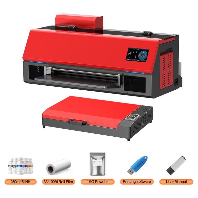 A3XP600 Printer+ A3 Oven + DTF Ink250ml *5 + 1KG Powder+ 33CM*100M Roll Film + RIPrint Software + Roll feeder + User Manual