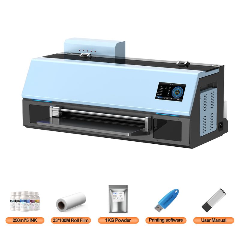 A3XP600 Printer+Shaker Machine + DTF Ink250ml *5 + 1KG Powder+ 33CM*100M Roll Film + RIPrint Software + Roll feeder + Video instructions