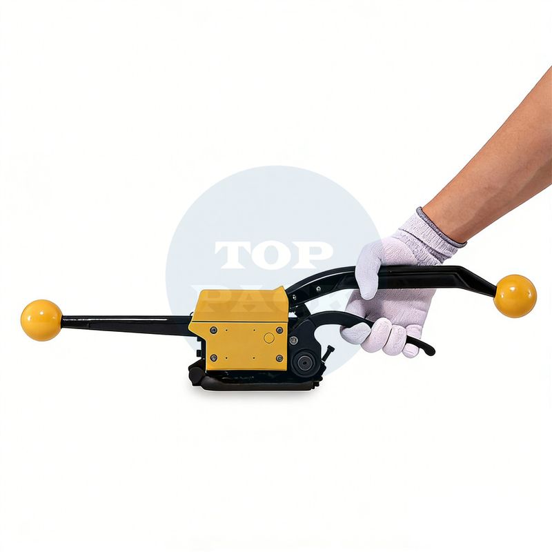 The steel strapping A333 manual tool is used to wrap and strap flat packages like pallets, bales, crates, cases, steel, aluminum bars, and other heavy packages.