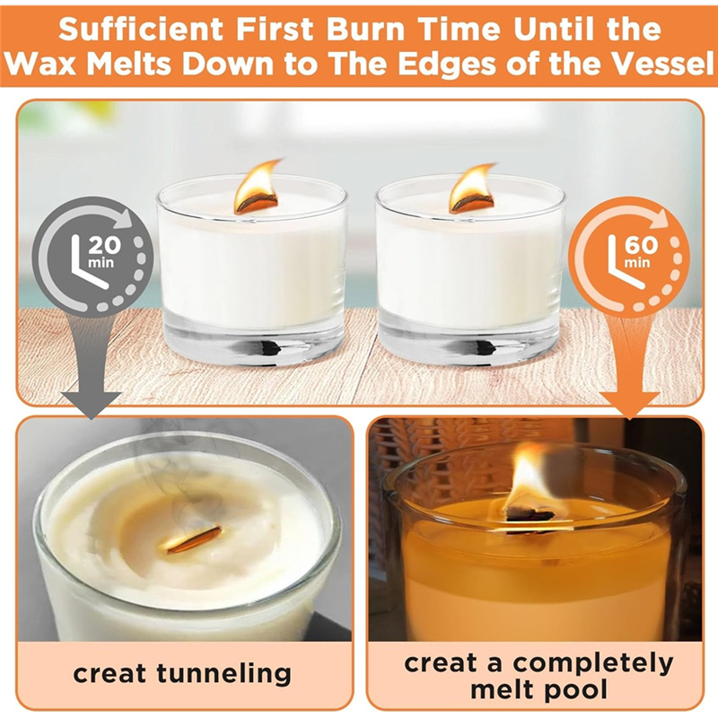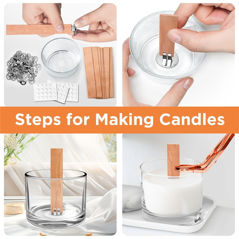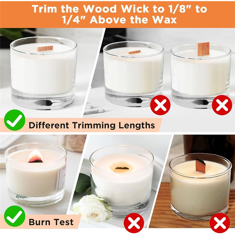 Come with metal base clips that help to hold wicks in place and stay straight for more stability and less tilting. Also includes a wick trimmer, so you can trim the wooden candle wick to the suitable length you need. It's important to trim the wood wick to 1/8inch to 1/4inch above the wax.