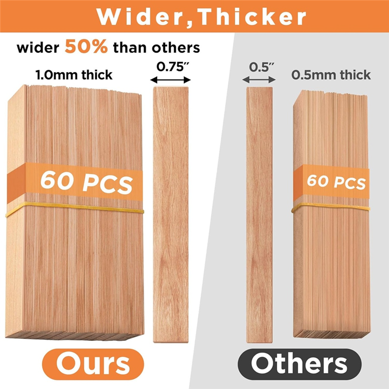 60pcs natural candle wicks with 60 pcs metal base, 60pcs base stickers, and a rose gold candle wick trimmer. The size of each wood wick for candles making is 5.1 x 0.75x0.04 inches (13x1.9x0.1cm ), which is thicker than others. You can make a wider candle or just make a smaller one as long as you trim the wick.