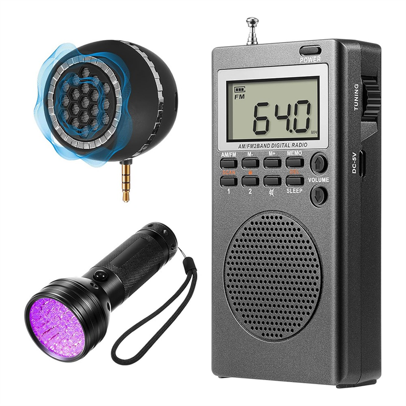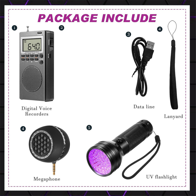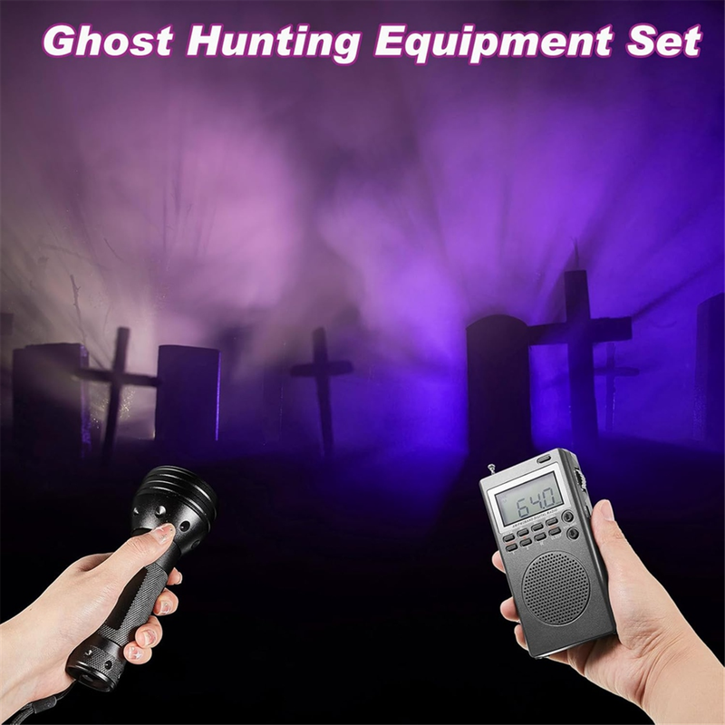 This equipment set is creatively designed for those curious about the unseen world; It includes a radio, a UV flashlight, and a speaker; For your convenience, the speaker is powered by a universal lithium battery, which is included in the package; Additionally, the radio itself is powered by three AA batteries, which are also included. our radio, small but powerful, can potentially detect the unseen; It is designed to be portable with high reception sensitivity; Quick responsiveness and augmented audio through a speaker allows for possible interaction with entities; The radio's reception across an impressive range, including FM1: 64-108MHZ, FM2: 87-108MHZ, and AM: 520-1710KHZ, with an additional antenna provided. The speaker in our kit is also fitted with a to enhance the audibility of any potential messages from the other side; This compact yet versatile device is also fitted of about 3.5 mm audio interface, conveniently compatible with multiple media devices. this kit includes a black UV light equipped with 51 UV LED designed for a large irradiation area; While , you can also use it to detect pet urine, or clean your house efficiently; It's an essential tool that serves multiple purposes. each piece of our paranormal investigation equipment is designed for straightforward operation; With no complex procedures that could impede your exploration, even non tech users can smoothly carry out their investigations; Whether it's a radio or a loudspeaker, an easy of the switch button initiates an automatic detection of the environment. Color: As Shown Material: plastic+metal Package Contents: 1set * Equipment Kit Only the above package content, other products are not included. Note: Light reflection and different displays may cause the color of the item in the picture a little different from the real thing. The measurement allowed error is +/- 1-3cm.