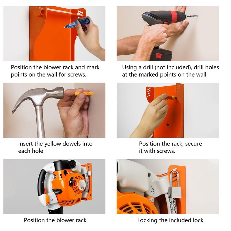 Universal Fit for Stihl Models: This versatile handheld blower rack is the ultimate solution for a range of Stihl models. Designed to seamlessly fit for Stihl BG-50, BG-56, BG-66, and BG-8 blowers, this bracket eliminates the hassle of searching for model-specific accessories. Whether you own one or multiple blowers, our bracket offers the perfect fit for your equipment, providing flexibility and convenience. Built for Durability: Crafted from robust iron material, this bracket is built to withstand the demands of outdoor use. The iron frame not only provides exceptional strength but also features a vibrant orange coating that offers protection against rust and corrosion. Rest assured that your investment is designed to last, even in challenging weather conditions. Space Saving: The blower rack allows you to easily store and retrieve the blower in a few seconds, freeing up extra storage space in garages, indoor or outdoor sheds and terrace areas. Provide effective storage space for your garage, garden, basement or warehouse, it can be installed anywhere on the wall, you are free to place your own special tools where you like. Heavy Duty Blower Rack for Stihl: The sturdy rack is durable to use, the installation is firm and not easy to fall. The Blower Rack is a flexible wall mounting solution for holding a handheld blower in your shed. Note:Due to different production batches, the product appearance may vary slightly, which does not affect the use. Colour:As Shown Material:Metal Package Contents: 1 * Frame 1 * fixing pin 1 * padlock 3 * screw rubber plug Only the above package content, other products are not included. Note: Light reflection and different displays may cause the color of the item in the picture a little different from the real thing. The measurement allowed error is +/- 1-3cm.