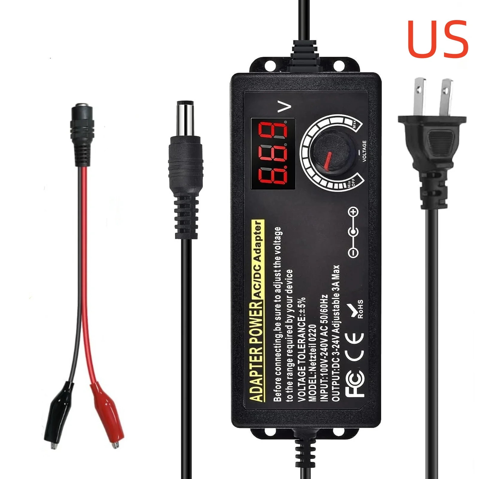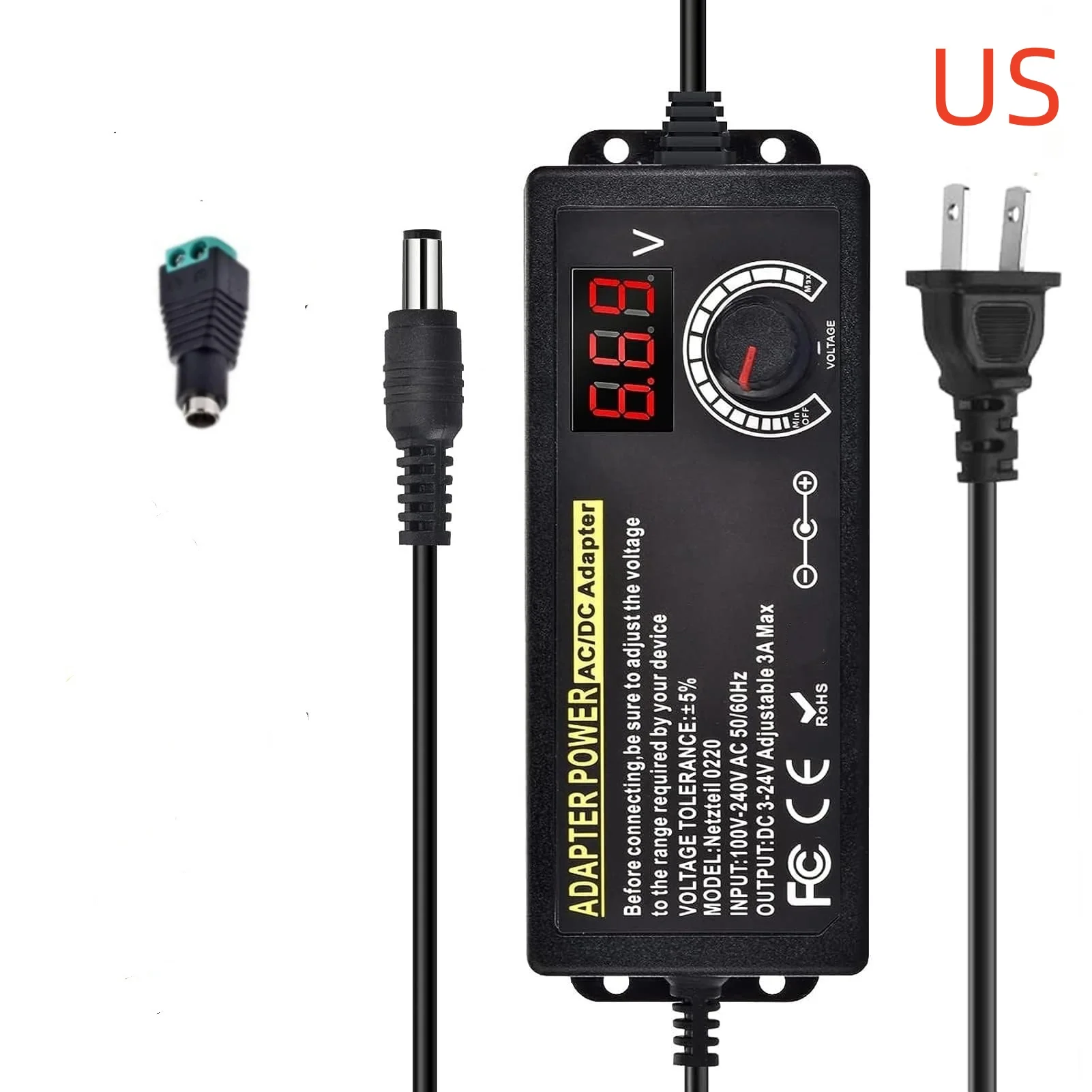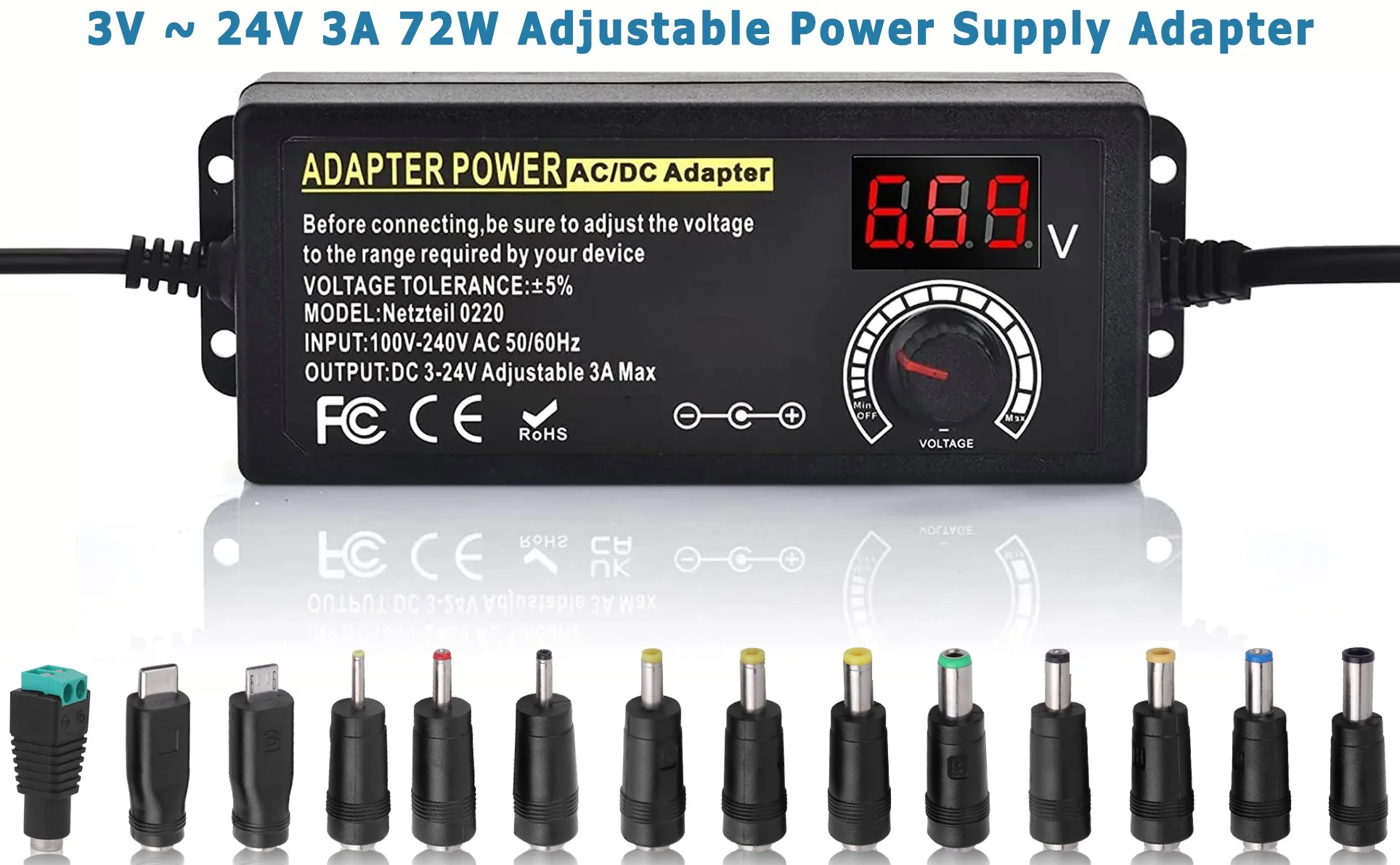 The product is a 3V-24V-3A with 72W Adjustable Power Supply Adapter.The product can support various security protections such as over voltage protection, over current protection, short circuit protection, over temperature protection, and anti-electromagnetic interference.