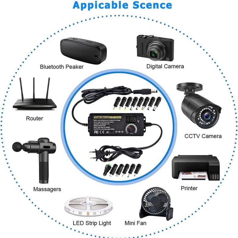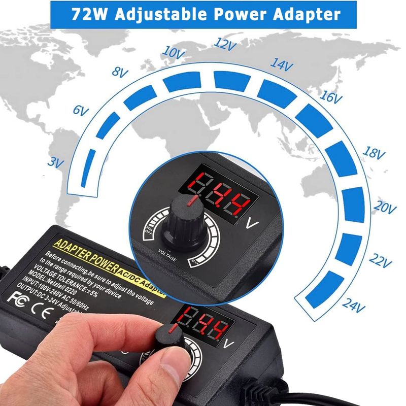 The product is a 3V-24V-3A with 72W Adjustable Power Supply Adapter.The product can support various security protections such as over voltage protection, over current protection, short circuit protection, over temperature protection, and anti-electromagnetic interference.